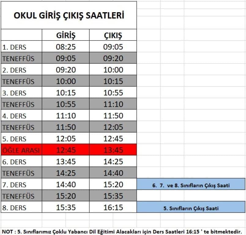2025 - 2026 Eğitim Öğretim Yılı Okul Giriş Çıkış Saatlerimiz