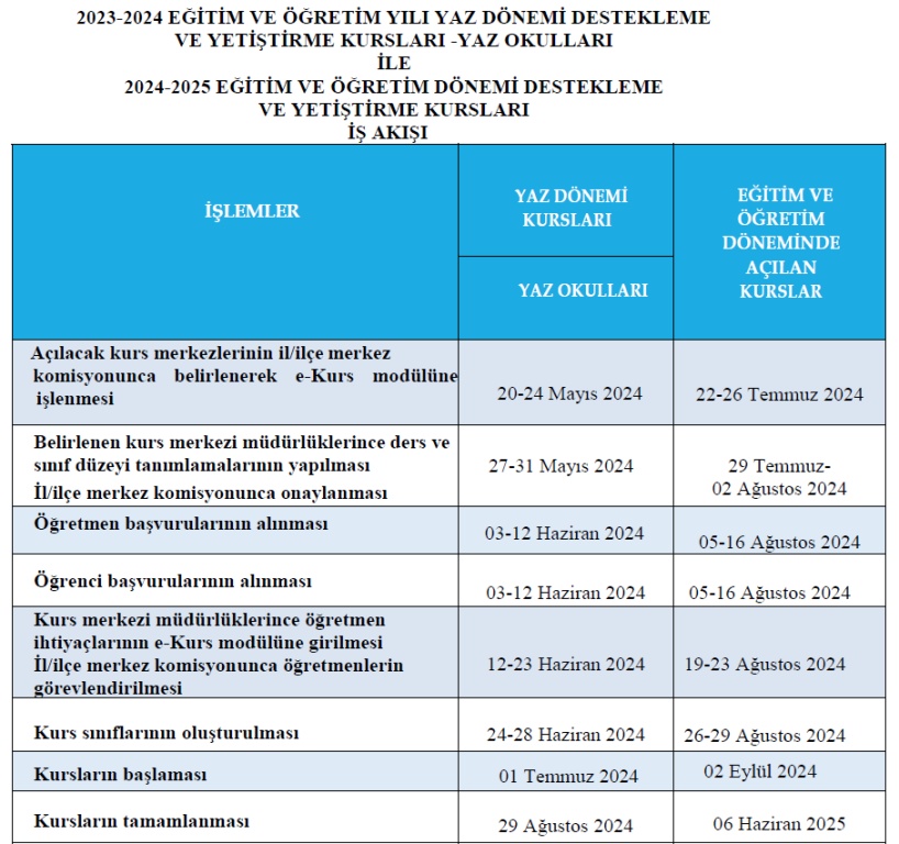 2025-2026 Eğitim ve Öğretim yılı Destekleme ve Yetiştirme Kursları İş Takvimi